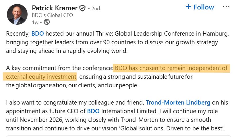 - But while others are chasing private equity money, BDO’s global CEO has drawn a clear line: “No external equity investors allowed.”
